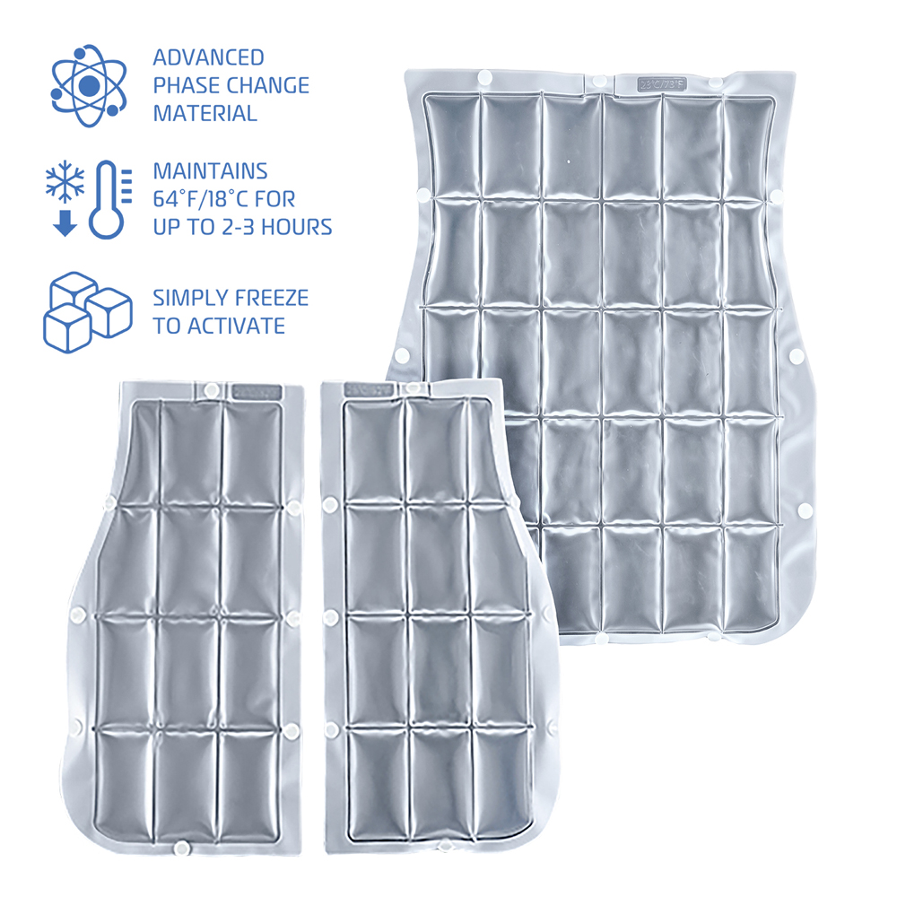 Reusable inserts for the AlphaCool Tundra Phase Change cooling vest. These water-based non-hazardous inserts hold a 64F temperature for 3-4 hours and can be recharged by being placed in the freezer for approximately 3 hours.