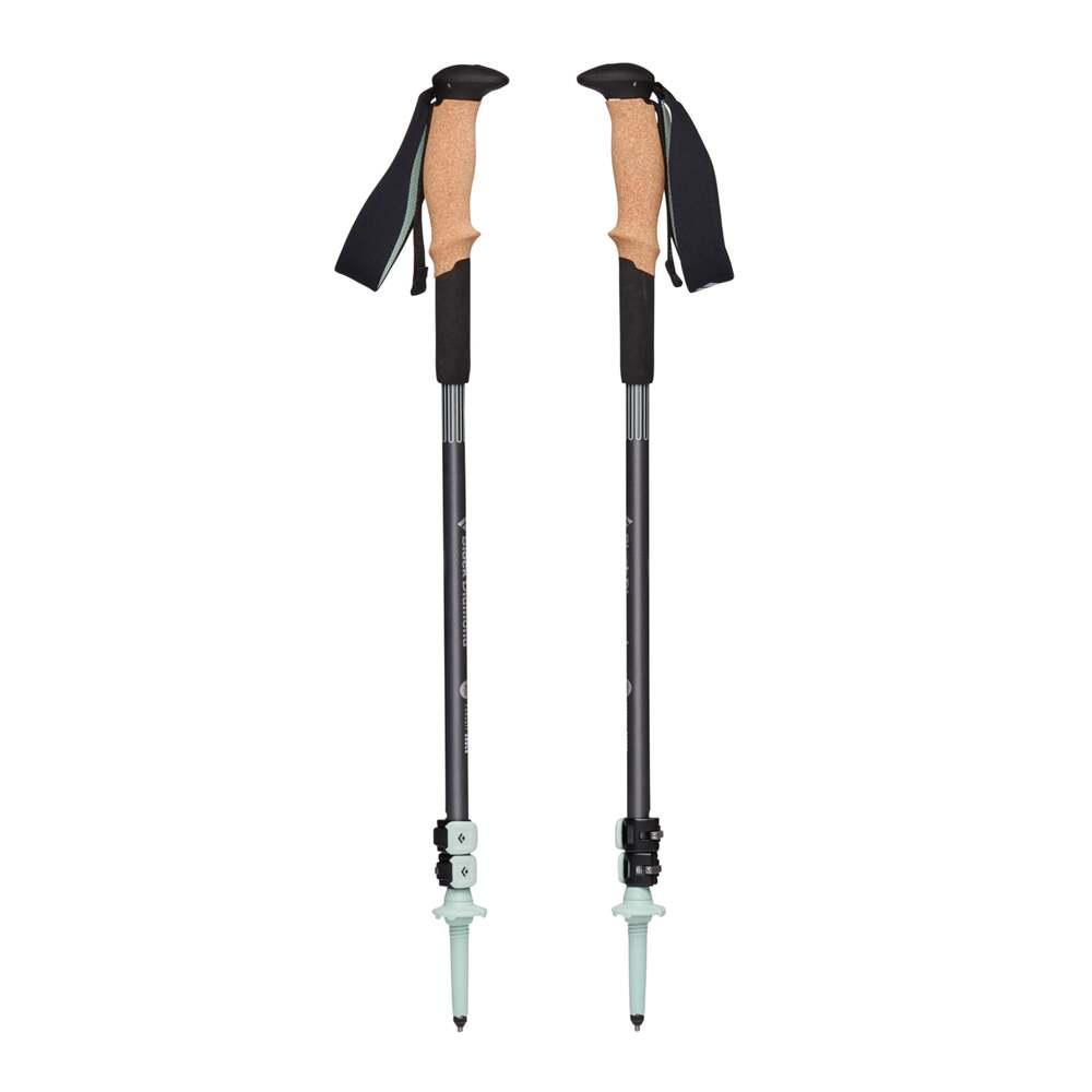 BD proprietary grip geometry and shape, with two grip sizes optimized for larger and smaller hands, make for more comfortable hand positions as well as reduces hand fatigue. Natural cork grips manage moisture while extensions – made from Bloom, an algae infused foam – provide additional hand positions on steep ascents. Hidden beneath the grip and the grip extension is a newly designed shock system that dampens vibrations to help reduce joint pain. Also included are Solution 2.0 wrist straps, made from post-consumer recycled fi bers, and a thoughtfully-designed, soft-touch FlickLock+ for quick and easy adjustments.