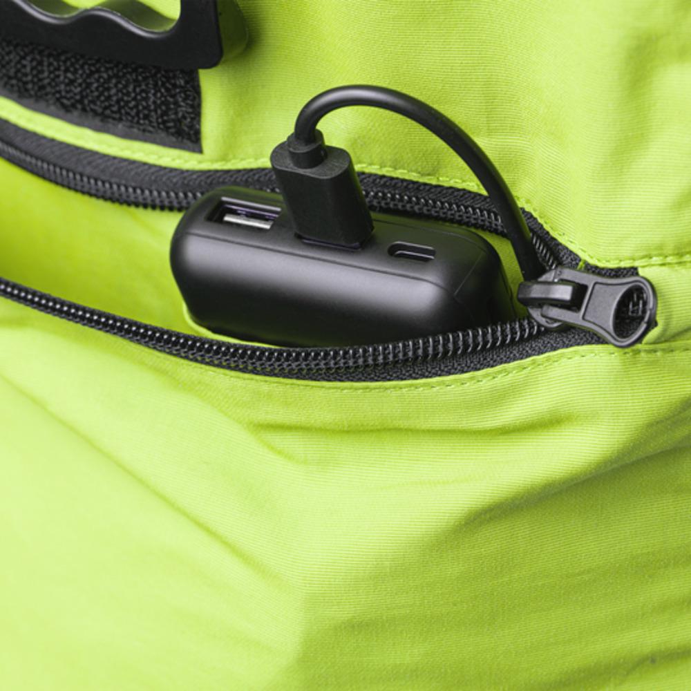Locate the connector: Connector is inside the back zippered pocket. Plug the connector into the USB-A connection on the battery. Place the battery inside the pocket, on the back of the vest, then zip the pocket closed.