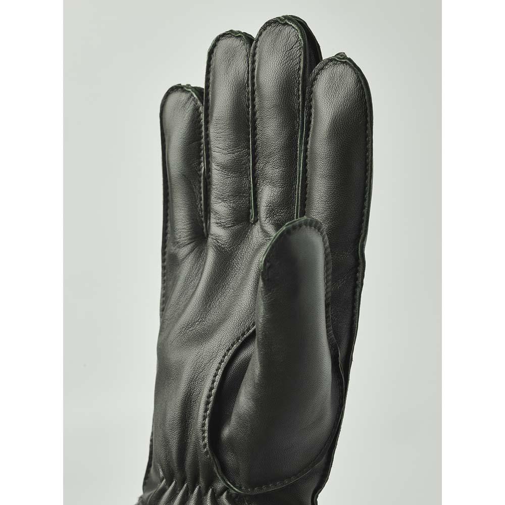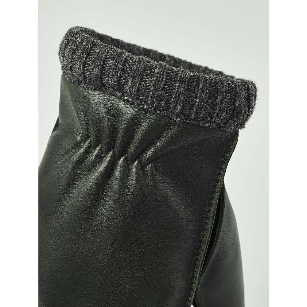 Stylish leather fashion glove with a light, warming synthetic liner. Sewn in soft lamb nappa with suppleness and a fine sheen. The cut is medium-high, with a ribbed cuff that contrasts nicely against the leather. A versatile accessory for chilly autumn and winter days.