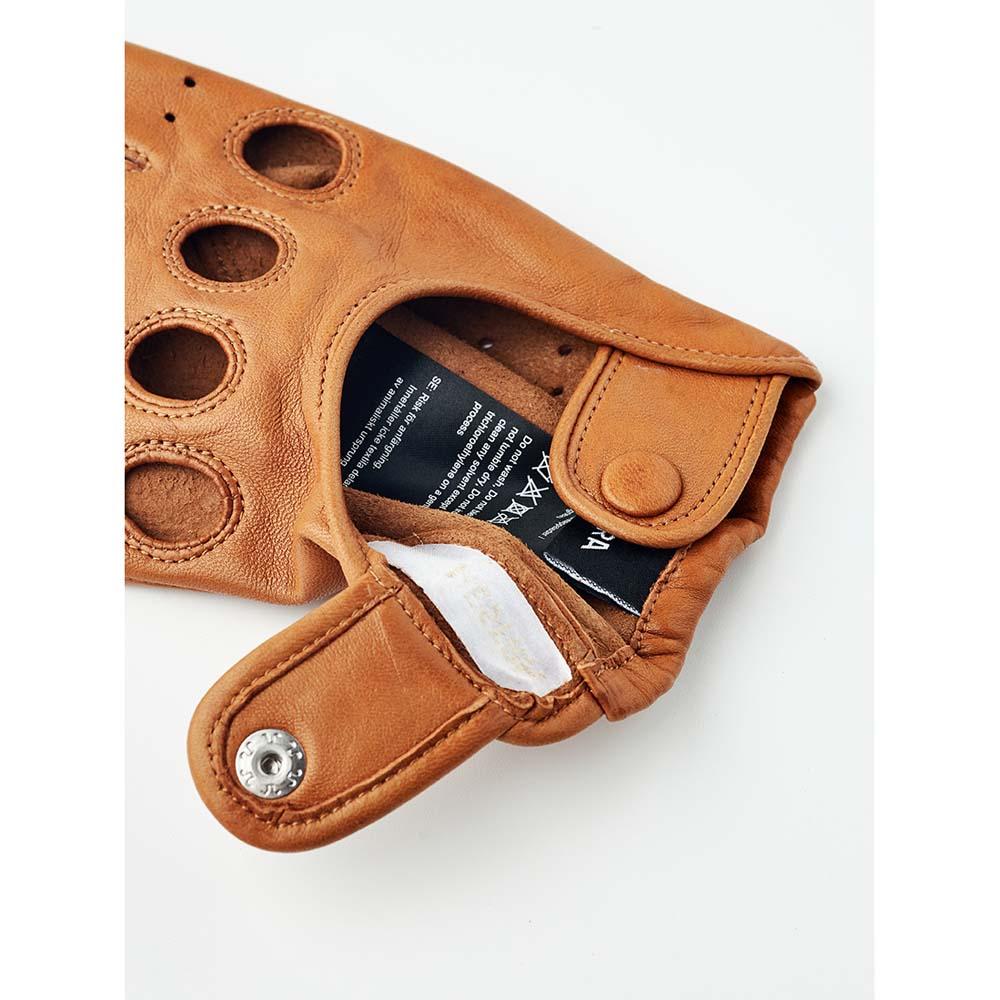 Thin glove in exclusive Italian lambskin nappa leather with a beautiful sheen. A classic so-called "driving glove" with a 1960s-inspired look. Top-quality materials and craftsmanship, with half-pique seams around the fingers and punched holes over the knuckles. Close-fitting, with a press stud for a snug fit around the wrist. With an open back and perforated fingers, it is perfect for spring and summer. Even if you can't run to an open-top sports car, you can still enjoy an air of sporty elegance.