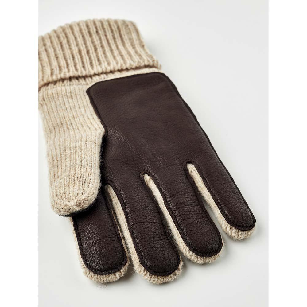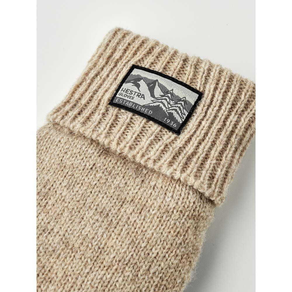 A classic wool glove knitted in stocking stitch with a deerskin-reinforced palm. Inspired by one of Hestra's popular 1990s designs, this is an easy to wear everyday glove for autumn and mild days in winter. A ribbed cuff folded double with a woven Hestra logo is an eye-catching detail at the wrist, while a thin knitted wool/polyamide lining adds extra warmth on cold autumn days.