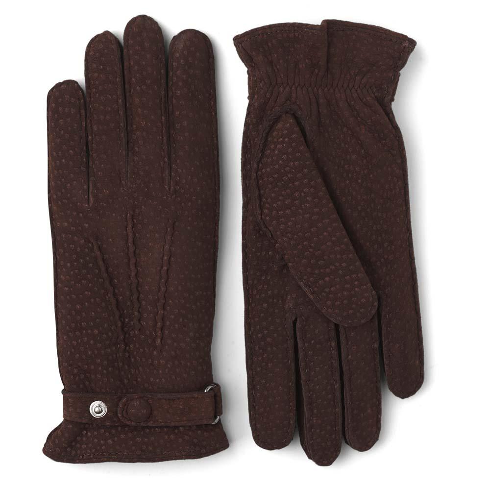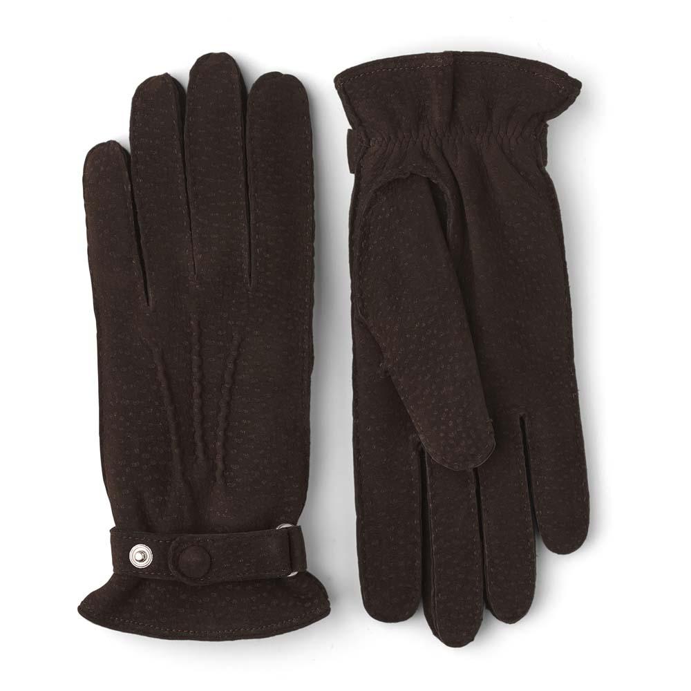 An exclusive, handsewn glove that can be tightened around the wrist with a strap. Made in carpincho nubuck, a soft, beautiful leather with an unmistakable "speckled" texture. The carpincho, also known as the capybara, is a rodent that lives in the plains of South America. Among glove cutters, the leather is seen as one of the finest in the world, with similar characteristics as peccary. It is surprisingly soft to wear, while also being strong and durable. This glove uses nubuck where the tanned surface is polished to produce a texture resembling suede. Each glove is cut by hand by skilled glove cutters in Budapest. Their sense for the material is unique and their craftsmanship utterly superb, producing a glove with fantastic fit and suppleness. The inside is lined with cashmere for a warming, soft, luxurious feel. Winston Carpincho is the personal favourite model of master glove cutter Niklas Magnusson, the fourth generation in the Hestra family business. That says something about the sheer quality of this glove.
