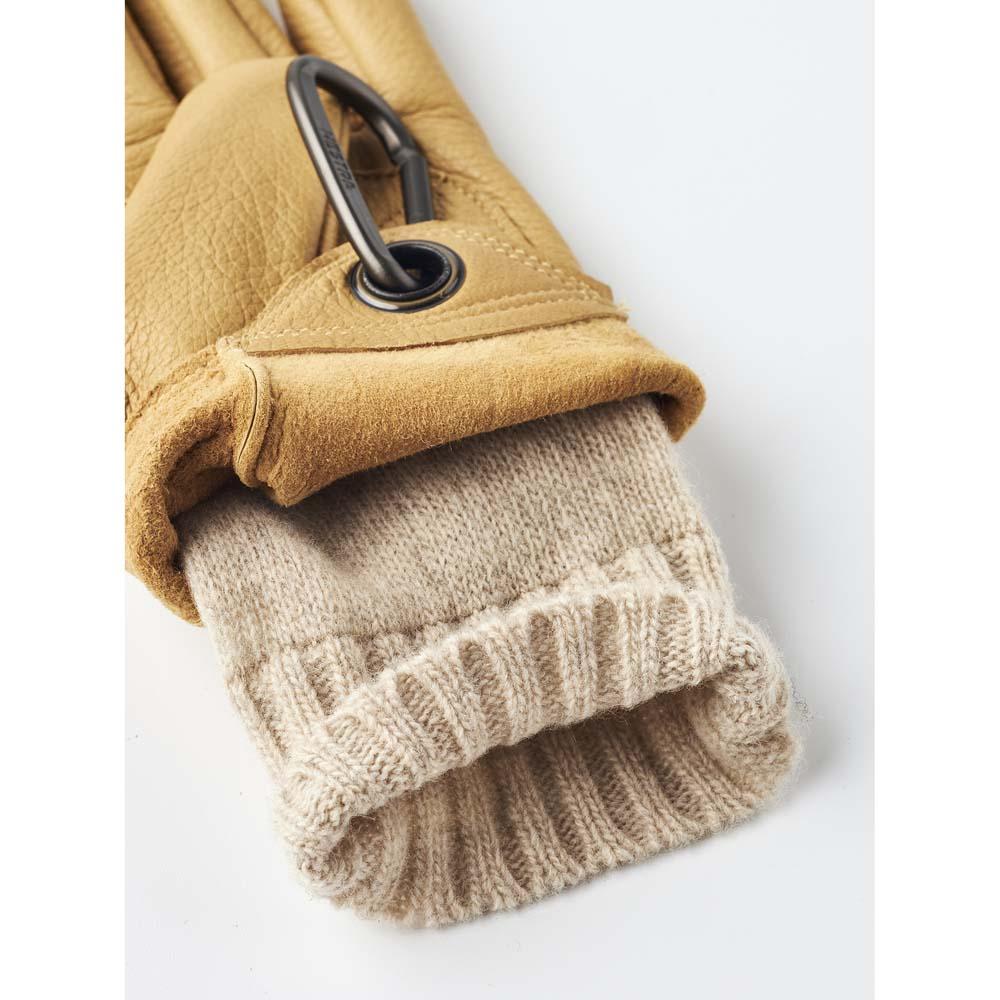 A slim-fitting, soft fashion glove in leather with a knitted lining. Beautifully designed details add character - such as decorative seams on the backhand and a practical eyelet at the inside wrist, making it easy to attach the pair of gloves to a bag or rucksack using the accompanying carabiner. The glove is stitched in hardwearing, supple goatskin, with a reinforced palm for extra strength. The knitted lining in a soft wool blend is comforting and warming on chilly autumn and winter days.