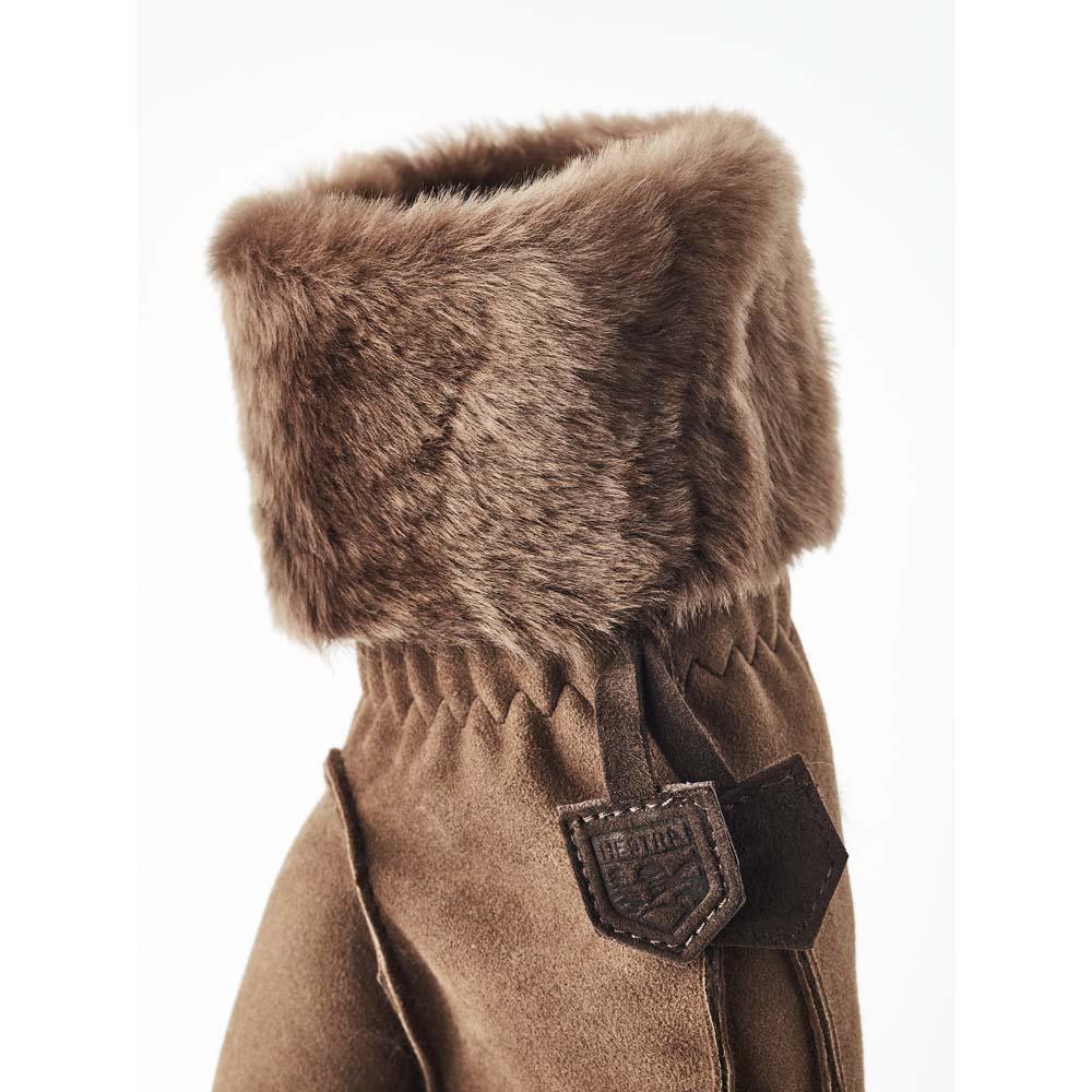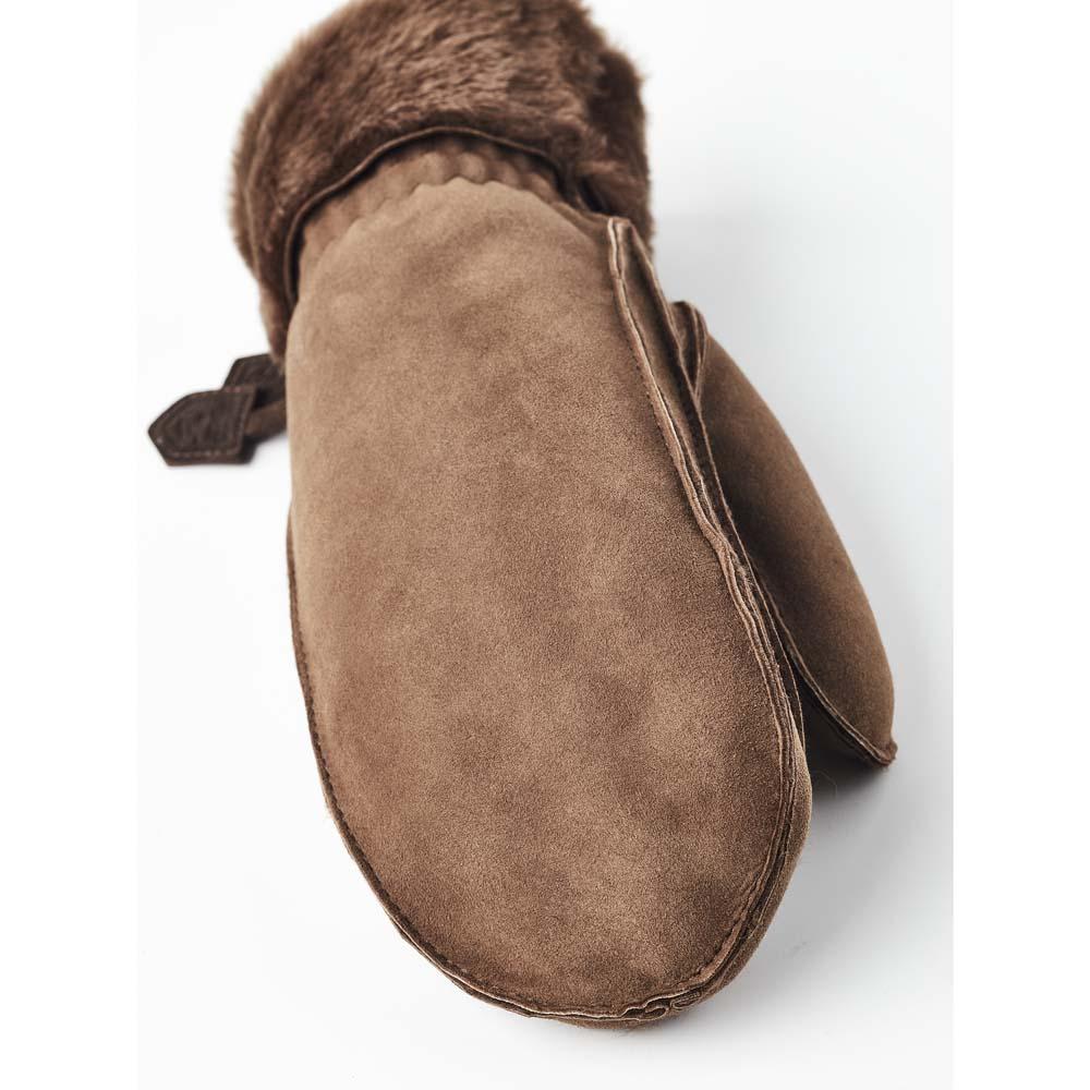 The Ilona Mitt is a soft and warm winter mitten for women, in lambskin suede with straight wool for a sophisticated look. The suede side of the material is turned to face outwards, displaying its beautiful texture, while the wide, folded cuff shows off the lambskin and adds a luxurious, feminine feel. Outward-facing seams, soft elastic around the wrist and a decorative tie embossed with Hestra shields completes the style. A timeless accessory for warmth on cold winter days.