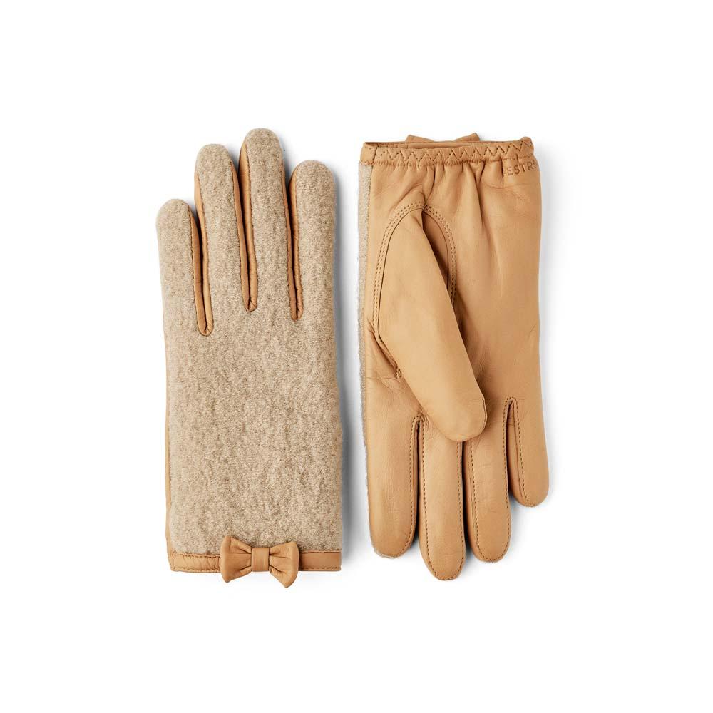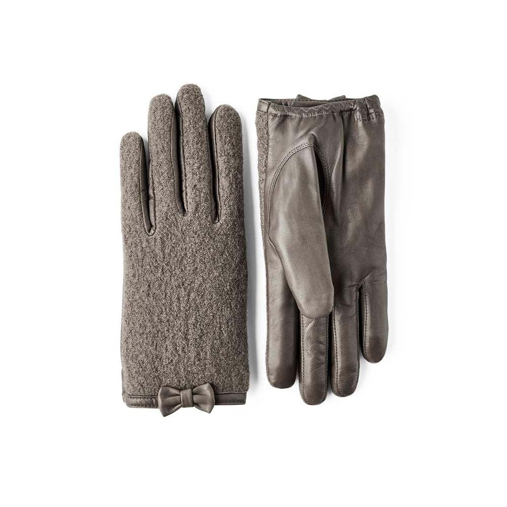 Classic and stylish, but with a twist - Millie is a neat fashion glove for autumn, spring and less chilly winter days. The palm is made from ultra-soft Italian lamb nappa with a beautiful sheen. The boucle knitted backhand contrasts with the smooth surface of the leather. The fit is close to the hand, with a thinly knitted wool/polyamide lining. Finely worked details include pique stitching along the fingers, leather edging and a small bow on the outer wrist. A timeless fashion accessory for everyday use and special occasions.