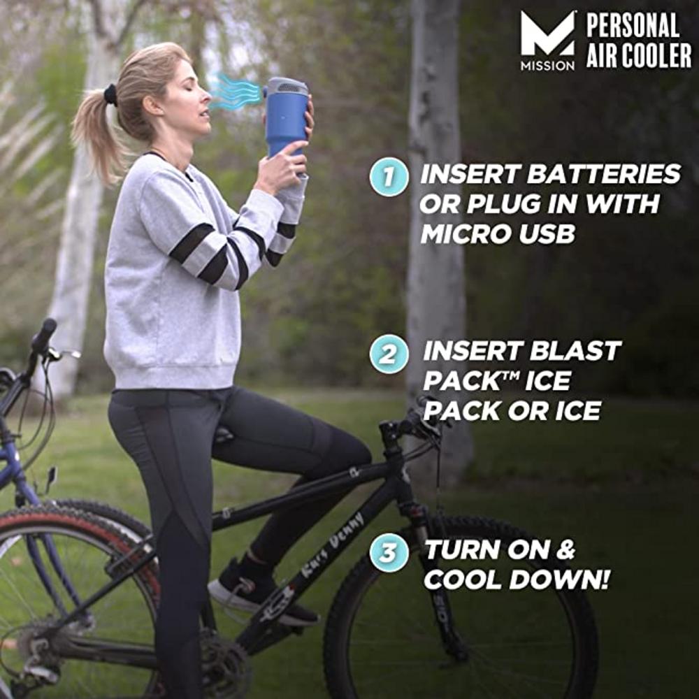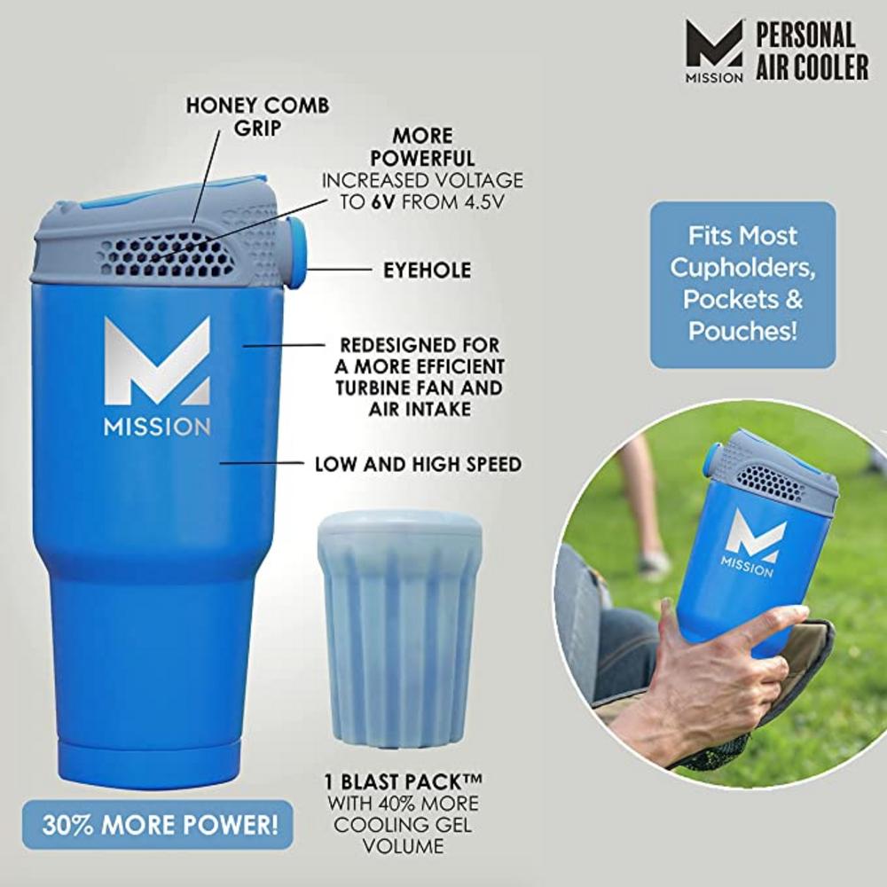 Keep cool anywhere with just the push of a button. The new MISSION Instant Cooling Fan is a portable, personal air cooler that projects cool air as low as 55 degrees. Designed to fit in any cup holder (exercise bike, car, stroller), the double-walled chamber keeps the three interlocking ice packs (included) frozen while the internal turbine fan projects cool air. Ideal for any activity. Whether you're at the amusement park for the day or at the desk - the MISSION Instant Cooling Fan will provide long-lasting cooling when it counts.