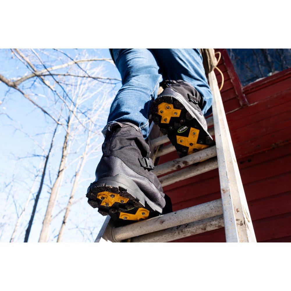 The Voyager with Heel overshoe features Glacier Trek SPK outsoles with 32 replaceable cleats embedded in the sole to help maintain traction in the harshest winter conditions. Visit our blog, "The Worker Boot", for additional information on these overshoes and product photos. The rugged but lightweight outsoles provide excellent slip resistance on ice and snow. The heel on this version of the NEOS Voyager provides added security on snowy or icy ladders. Not to be used on hard surfaces.
