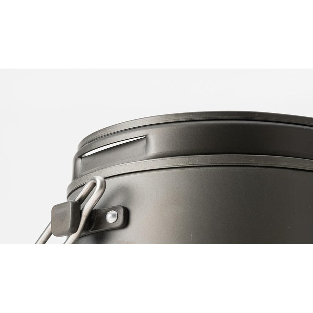 The cook set is large enough to store fuel canisters, a small stove, and utensils for a compact kitchen kit.