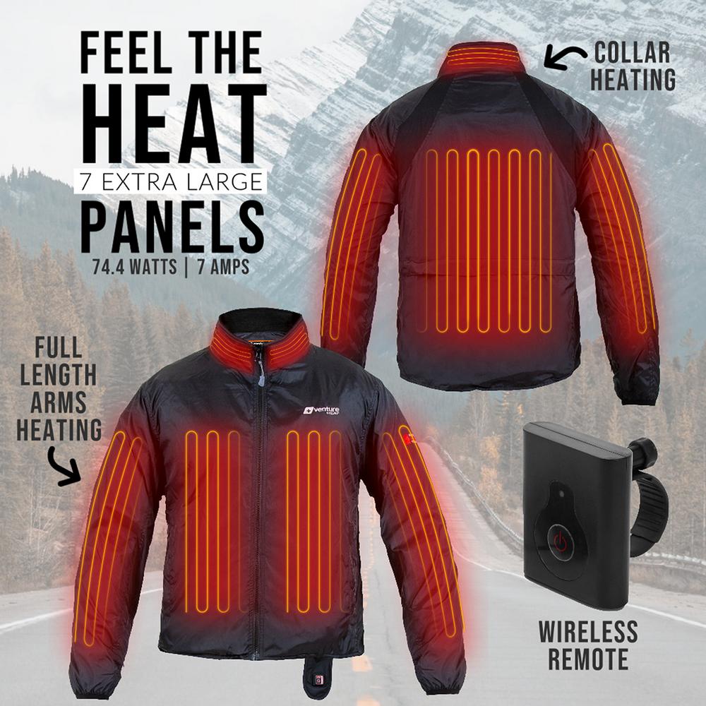 Deluxe Motorcycle Heated Jacket Liner High-Performance warmth for your body for extreme cold weather riding (7 Amp) Venture Heat's most comfortable heated jacket liner ever! This 12V Heated Motorcycle Jacket Liner with Wireless Remote is sure to keep you warm during any winter ride.Venture Heat's Grand Touring 12V Heated Jacket Liner is a dream come true for any motorcycle rider taking on the elements. This lightweight jacket is windproof and water-blocking to help protect you from the cold weather. Its slim design and form-fitting construction allow you to wear this jacket liner underneath your regular riding jacket. With a built-in temperature controller, you can adjust the heat to 3 different heat settings with just the touch of a button. This heated jacket also features a wireless remote that can be attached to your handlebars so that you can control the heat without ever having to take your eyes off of the road.