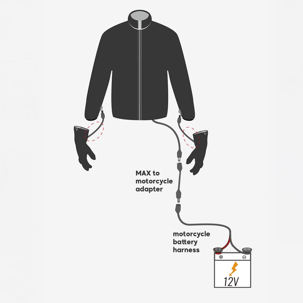 - Converts MAX Series heated jackets/vests for use with 12V motorcycle power
