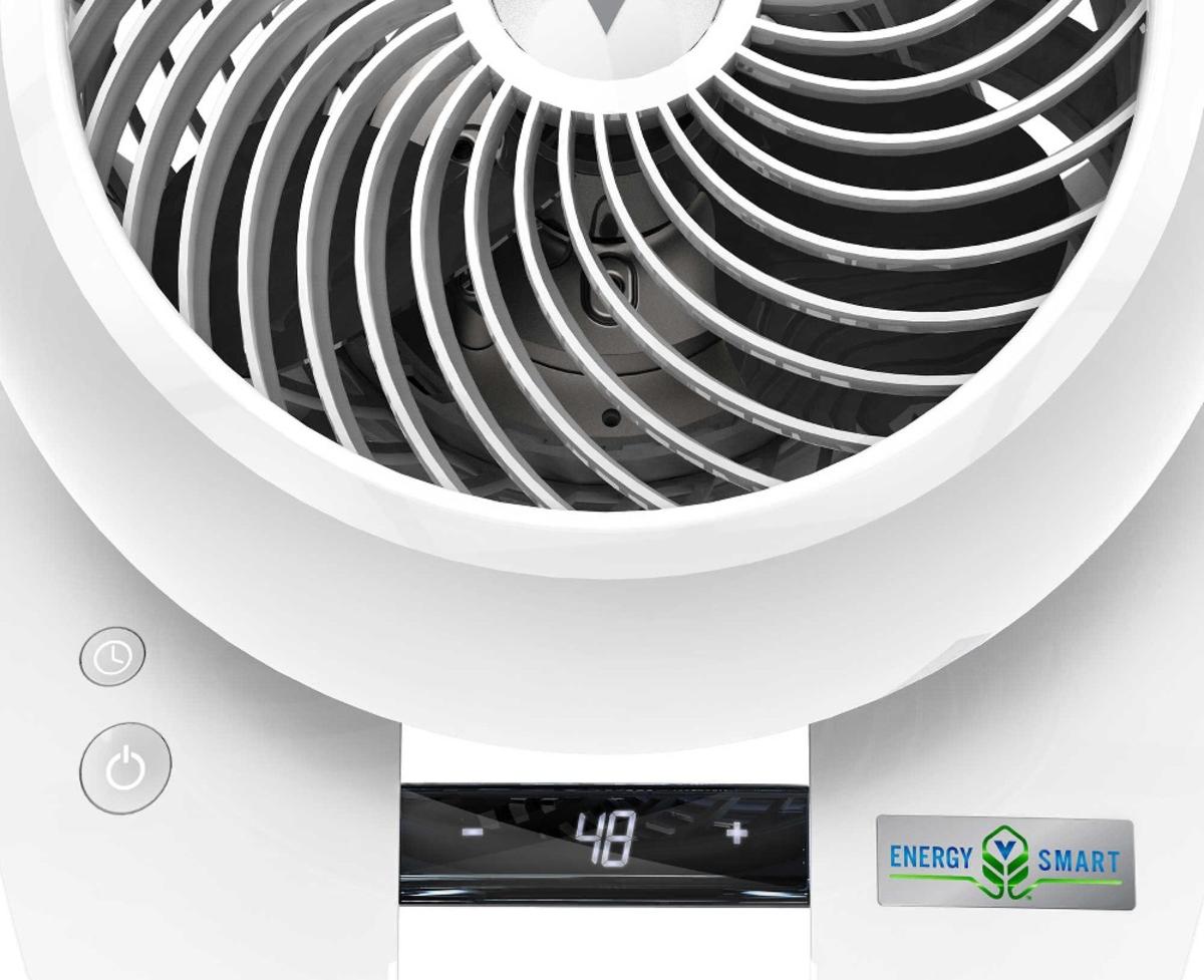 The 5303DC is Vornado\xCDs debut circulator in the new Energy Smart\xBB family. Combining sleek style with a more-powerful airflow (up to 80\xCD), the brushless DC motor uses up to 80% less energy, bringing modern efficiency to the home. A return to variable speed puts you in precise control of your environment via 99 unique airflow settings, and an energy-saving timer shuts off the air when it\xCDs not needed. Electronic push-button and touch controls, plus a remote control, bring added convenience. Complete with our 10-year satisfaction guarantee, these DC circulators will keep you comfortable for years (and years) to come.